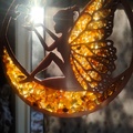 Denne smukke rav solfanger er skåret i birketræ og hånd dekoreret med Rav, meget smukt når den hænger i vinduet og solen lige rammer, også dekorativt hvis man hænger den på køleskabet med de 2 små magneter den har.